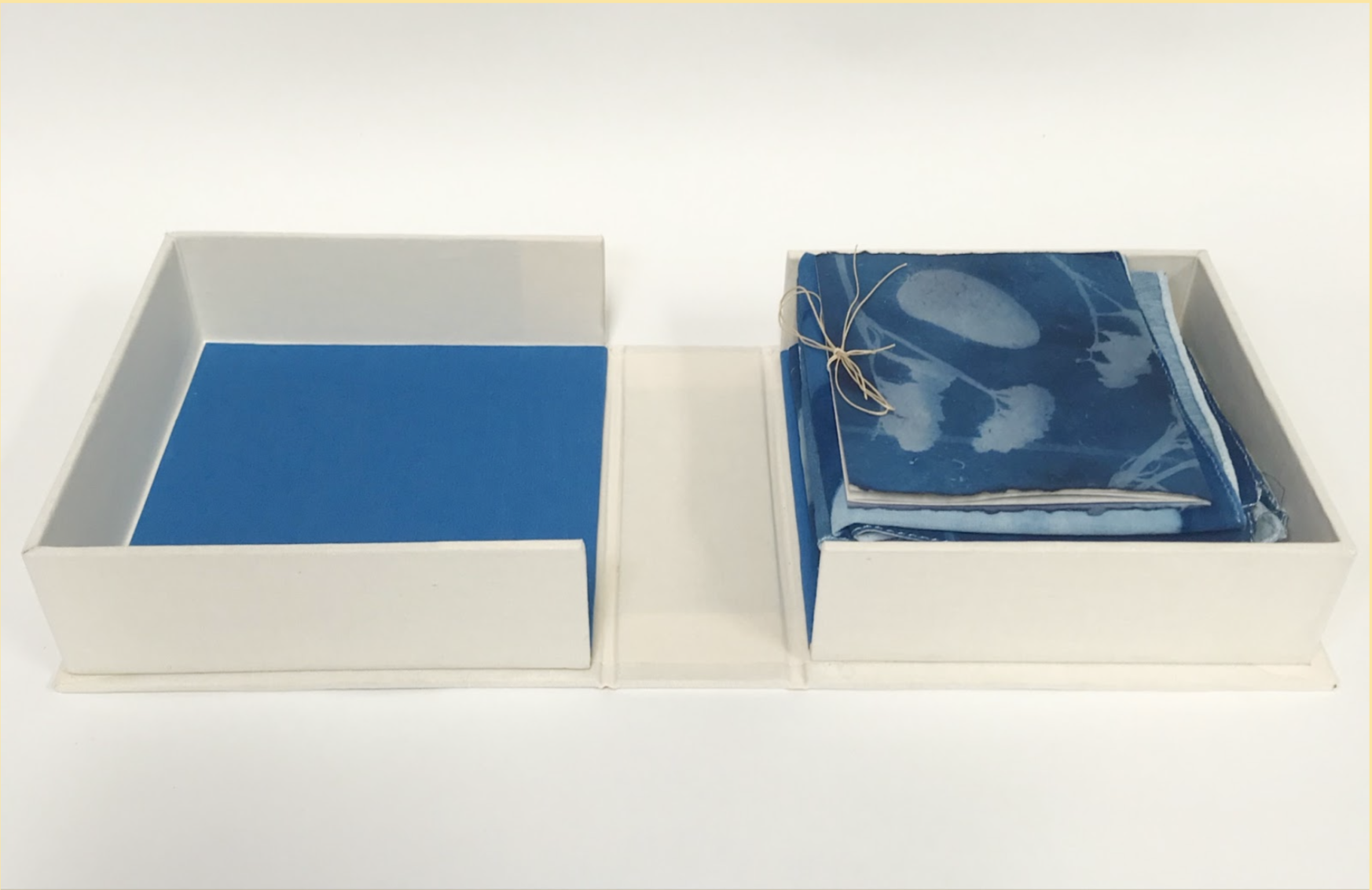 Book and box: Cyanotype on cotton fabric, cyanotype on handmade paper, screenprint, kozo, book thread, book cloth